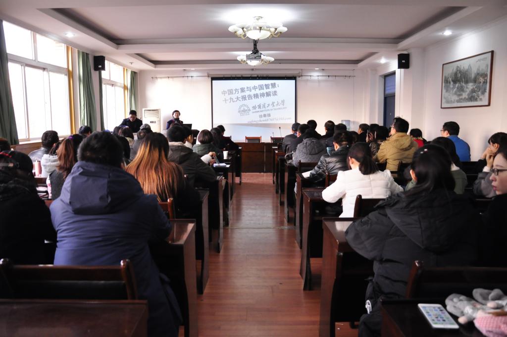 徐教授围绕学习党的十九大报告的意义价值、结构框架、重点内容、创新思想、主要特点与思考展望等六个方面,对新时代的主要内涵、社会主要矛盾的变与不变、十四点主要工作等进行了较为全面的讲解。整场报告内容充实、引经据典、旁征博引、深入浅出、娓娓道来。徐教授的讲座特点鲜明,一是充分体现了“三个统一”,即理论与实践的统一,具体与抽象的统一,历史与当下的统一;二是突出了“四讲”,即整场报告讲理论、讲文化、讲故事、讲事实,以理服人、以情动人;三是彰显了“五美”,徐教授贯穿于全场的形象之美、声音之美、语言之美、体系之美、内容之美,让听众如痴如醉。