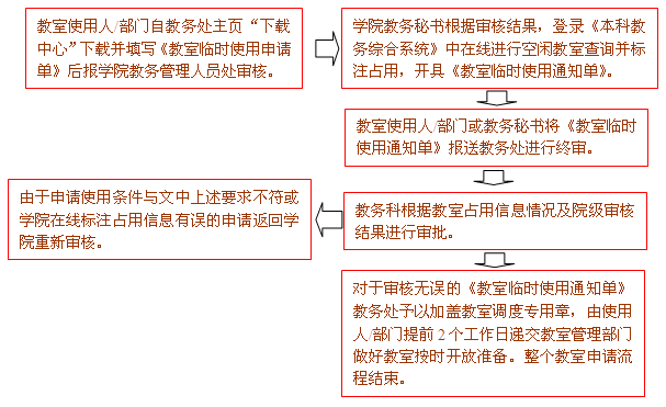 由教室使用教研室/教师填写《长安大学教室临时使用申请单》并详细写明用途、教室类型、使用时间和人数等情况,送交本单位教学秘书进行审核。教务秘书在线根据教室空闲状态对拟借用的教室标注“占用”处理,并根据审核结果开具《教室临时使用通知单》。通知单由借用教研室/教师至少提前三天递交教务处进行审批,教务处审批后根据学院审核意见进行处理。